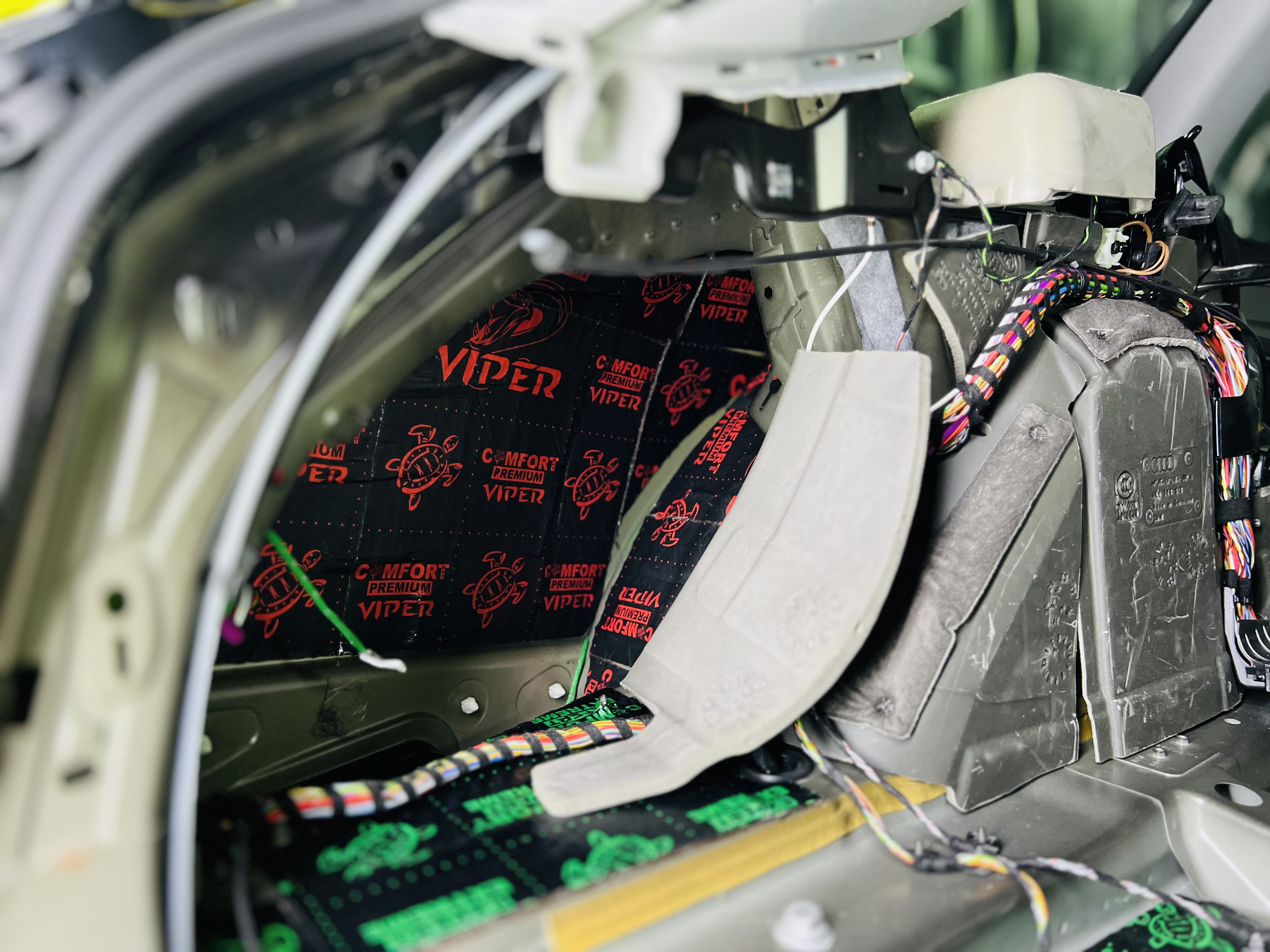 Первым слоем на дно салона и багажник нанесли виброизоляцию Comfort Mat Extreme, материал с двухслойной фольгой толщиной 6 мм, а на стенки багажника – Comfort Mat Viper.