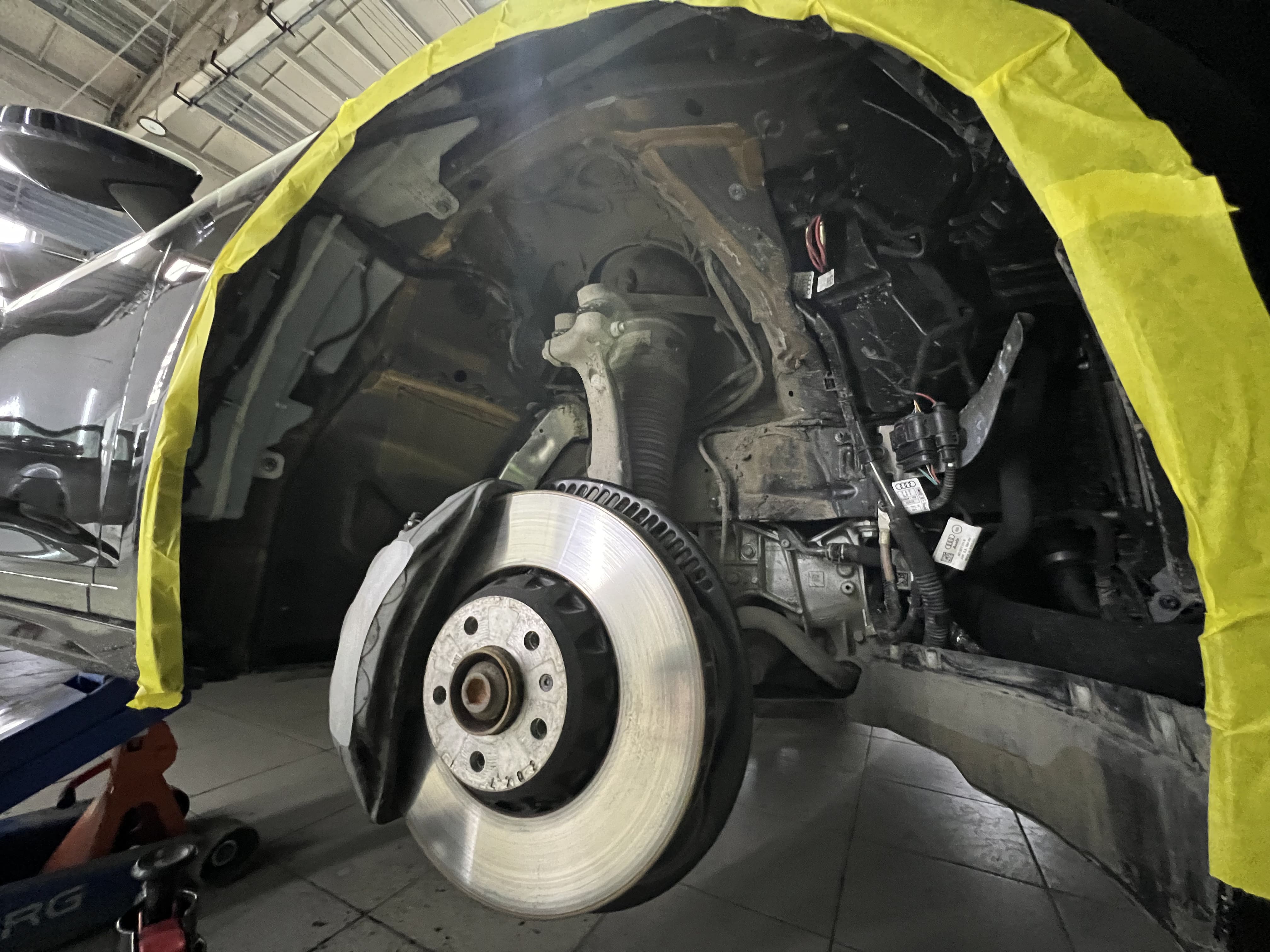 Работа началась с демонтажа колеса и подкрылок, для чего автомобиль подняли на домкрат.