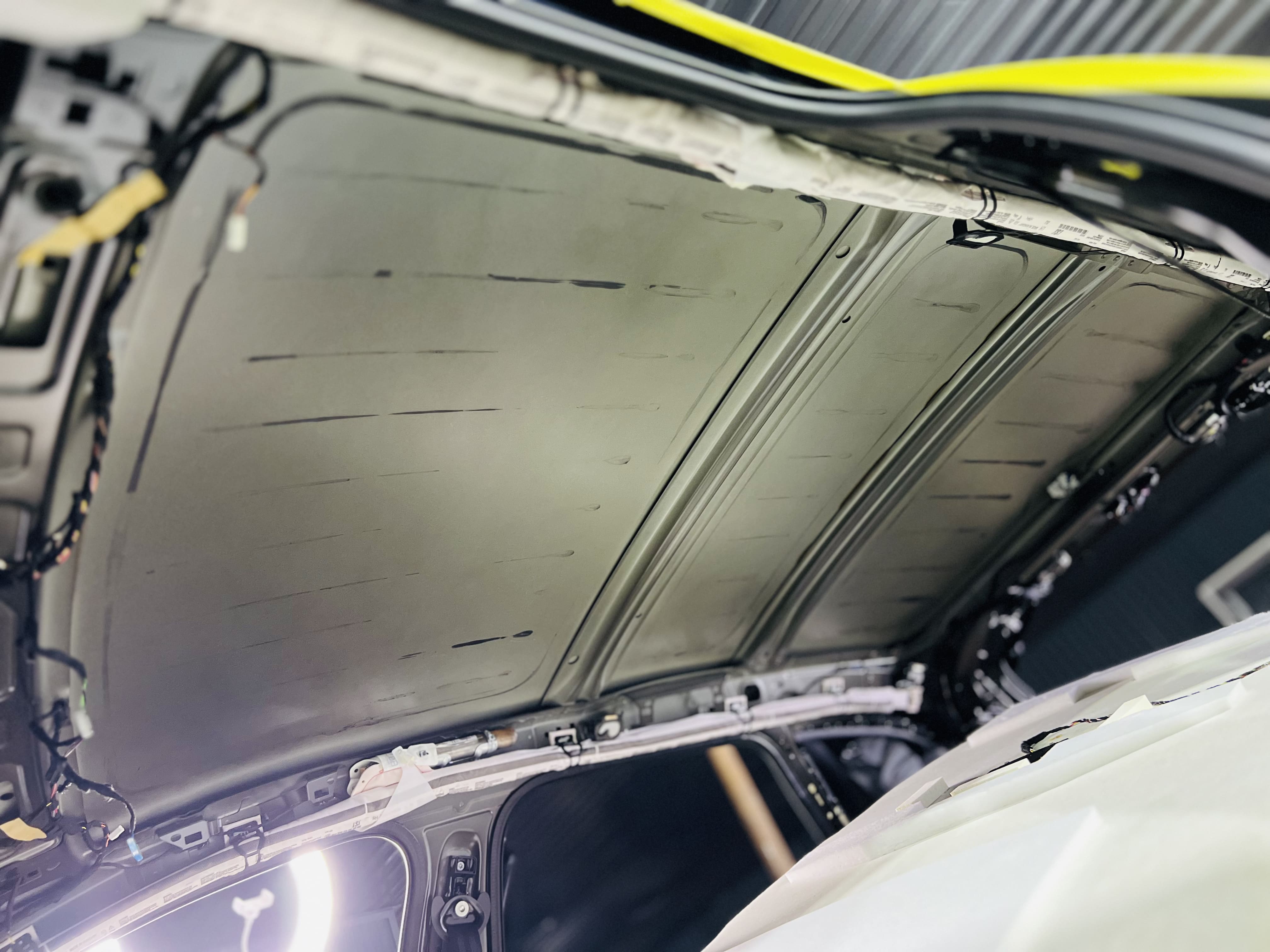 Процесс нанесения первого слоя требовал высокой точности. Первым слоем на крышу нанесли виброизоляцию Comfort Mat Viper, ультралегкий инновационный материал премиального уровня толщиной 3 мм.