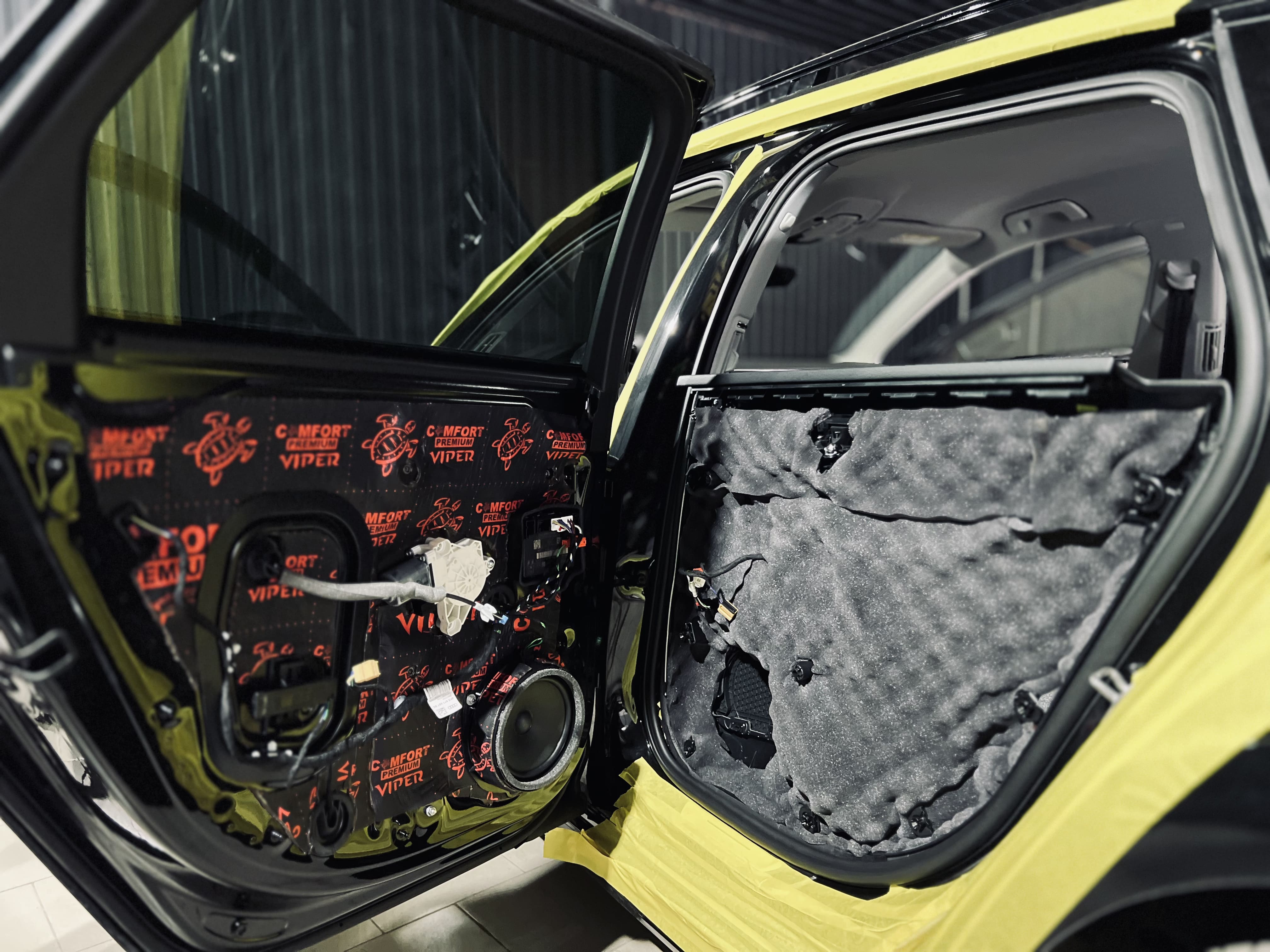 Первым слоем на двери нанесли виброизоляцию Comfort Mat Viper.