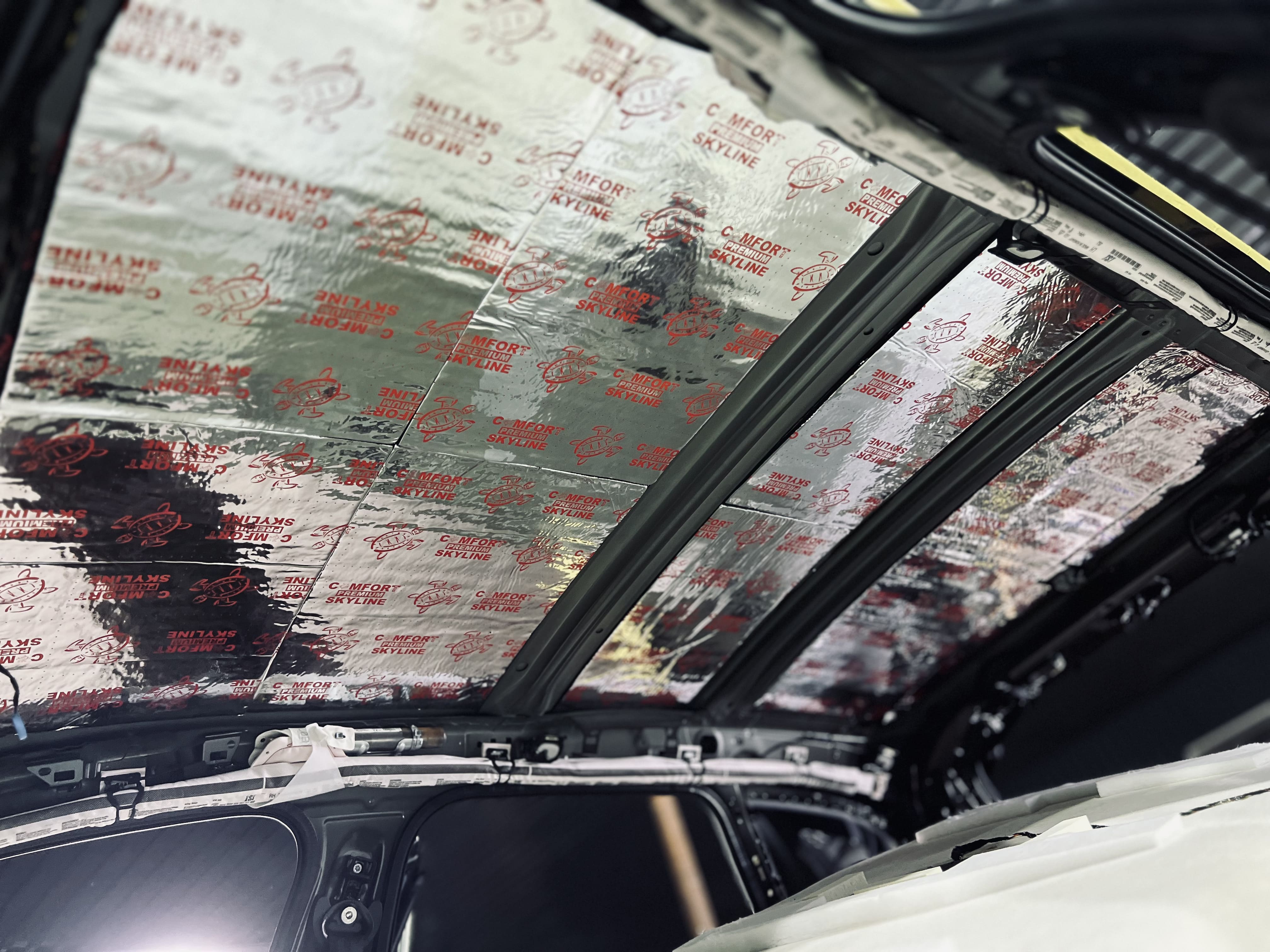 Процесс нанесения первого слоя требовал высокой точности. Первым слоем на крышу нанесли виброизоляцию Comfort Mat Viper, ультралегкий инновационный материал премиального уровня толщиной 3 мм.