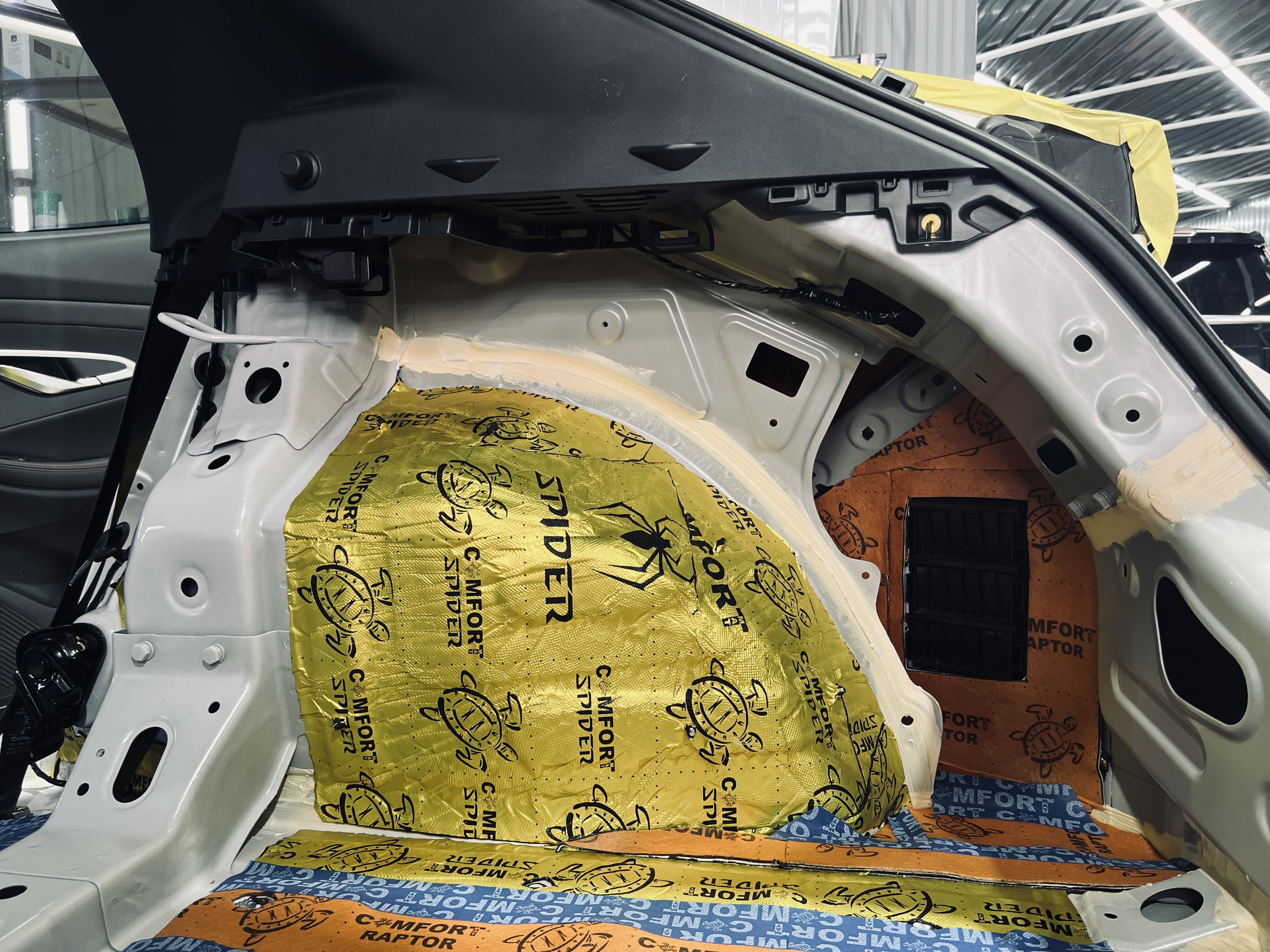 Первым слоем на днище и дно багажника нанесли виброизоляцию Comfort Mat Spider. Этот материал эффективно гасит вибрации кузова, создавая прочную основу для дальнейшей изоляции.