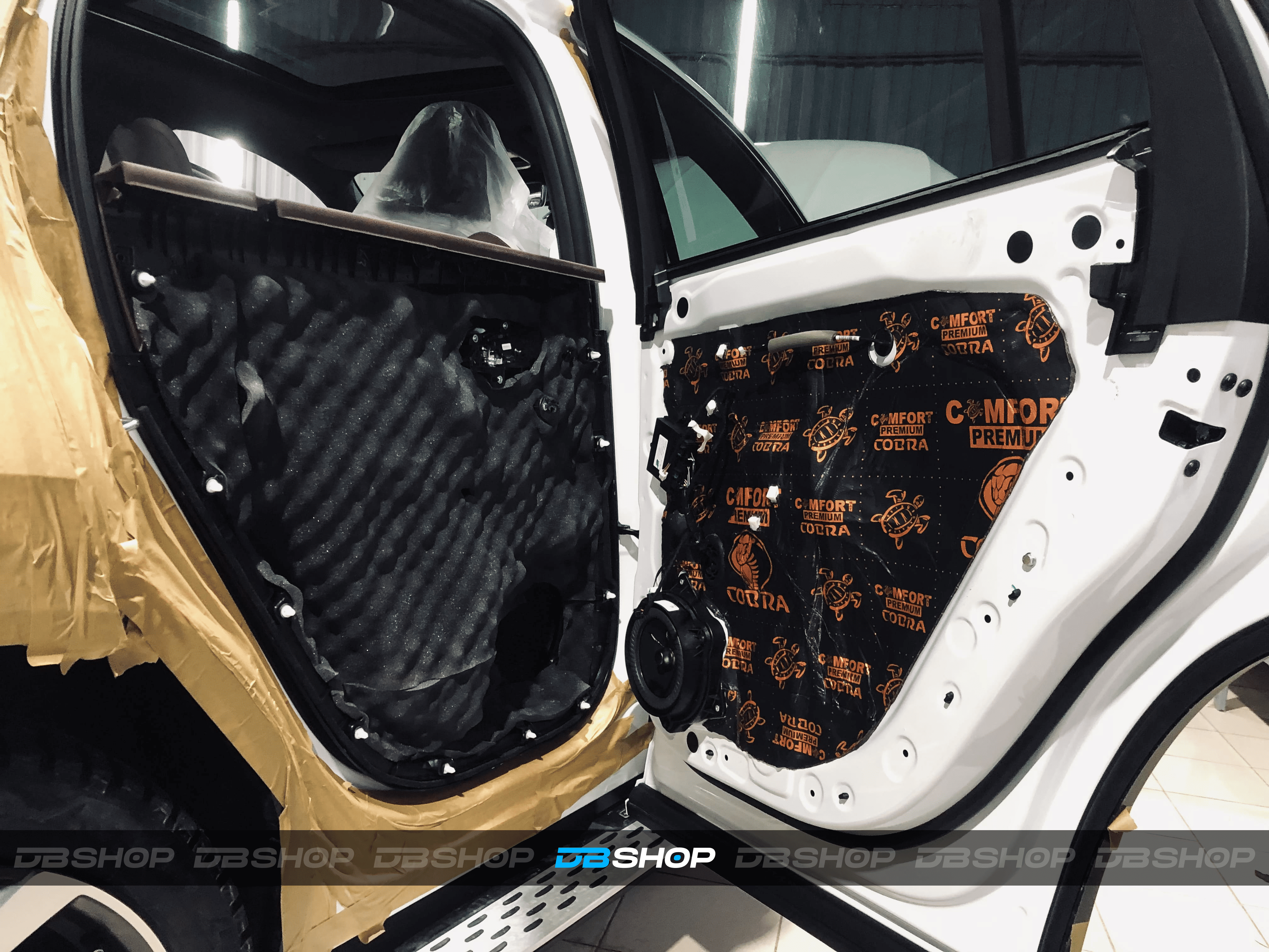 Первым слоем на двери и дверь багажника нанесли виброизоляцию Comfort Mat Premium Cobra. Инновационный шумоизолирующий материал толщиной 2,3 мм. Относится к премиальной серии, обладает улучшенным КМП. Отличается небольшим весом, а также защищает кузов от коррозии.