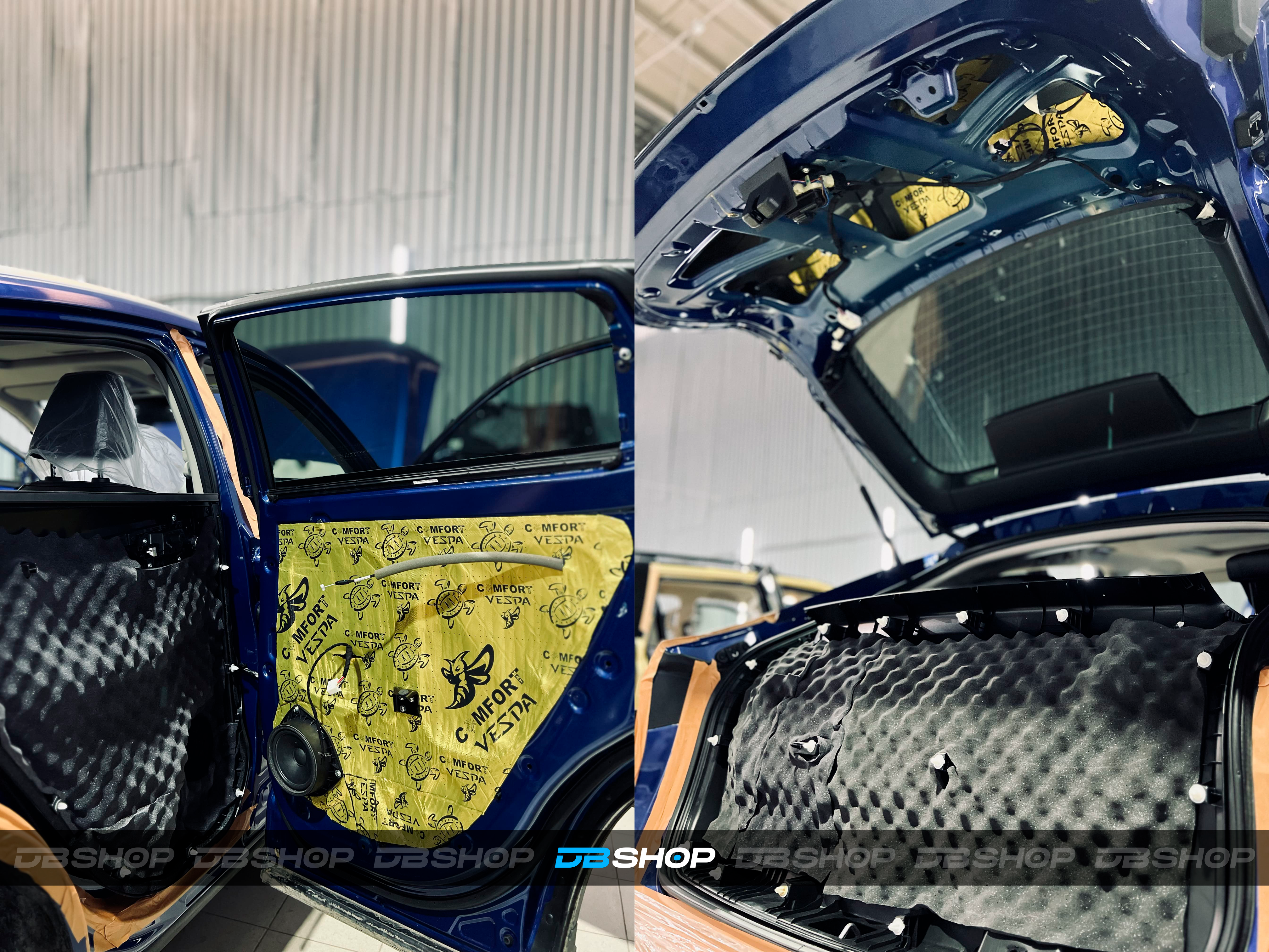 На двери и каркас двери, а также на дверь багажника нанесли виброизоляцию Comfort Mat Vespa и шумопоглощающие утолщенные волны Comfort Mat Тишина Volna, идеально вырезанные по размеру.