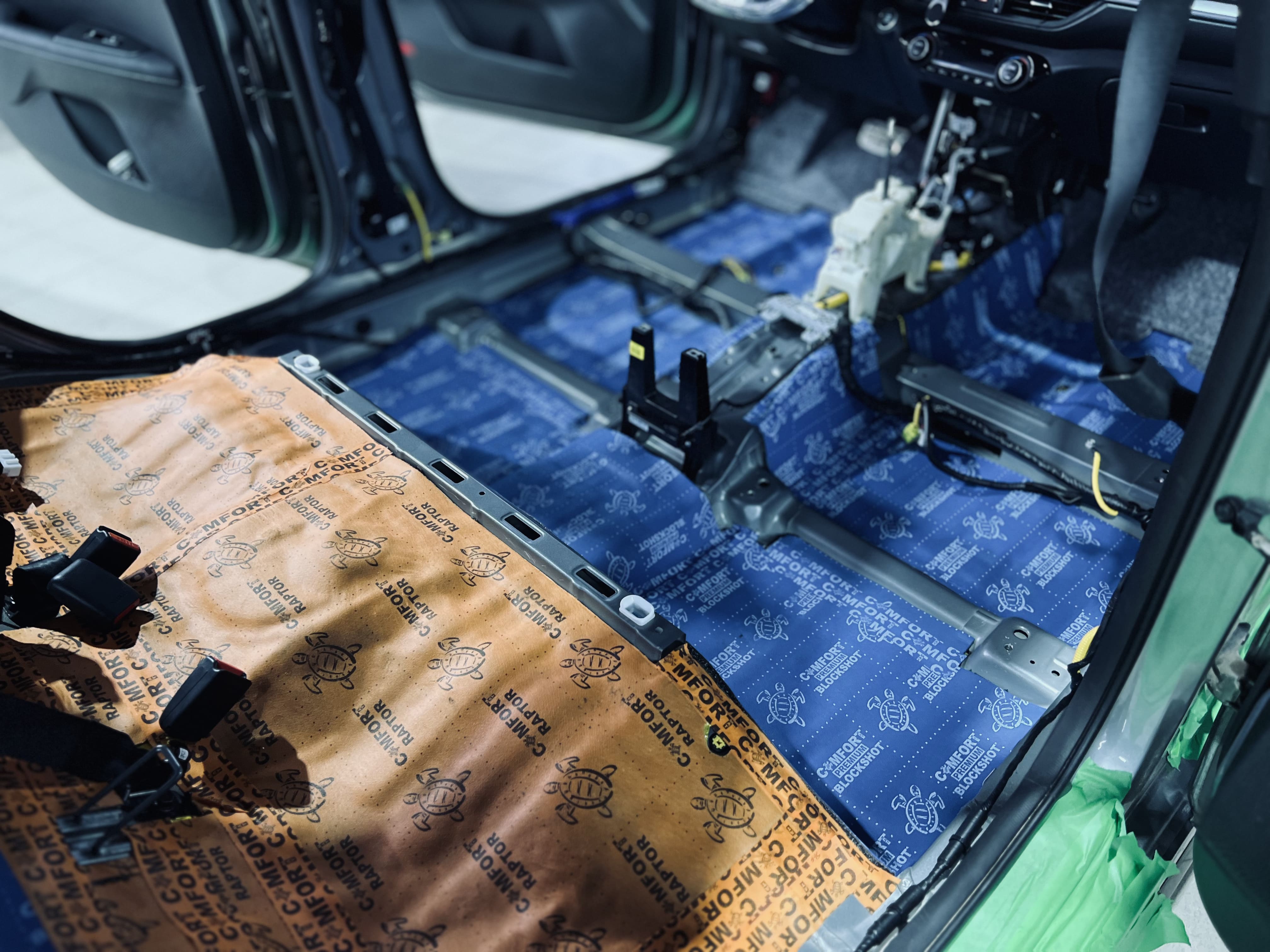 Вторым слоем в салоне применили комбинацию материалов: под задние пассажирские сиденья – Comfort Mat Raptor, в остальных зонах – Comfort Mat Premium BlockShot. На фото показаны готовые слои Raptor и Premium BlockShot, равномерно распределенные по днищу салона. Для закрытия швов и стыков мы использовали контурную ленту, подобранную в тон шумоизоляции, что не только повышает надежность, но и придает эстетичный вид, даже скрытый под ковровым покрытием.