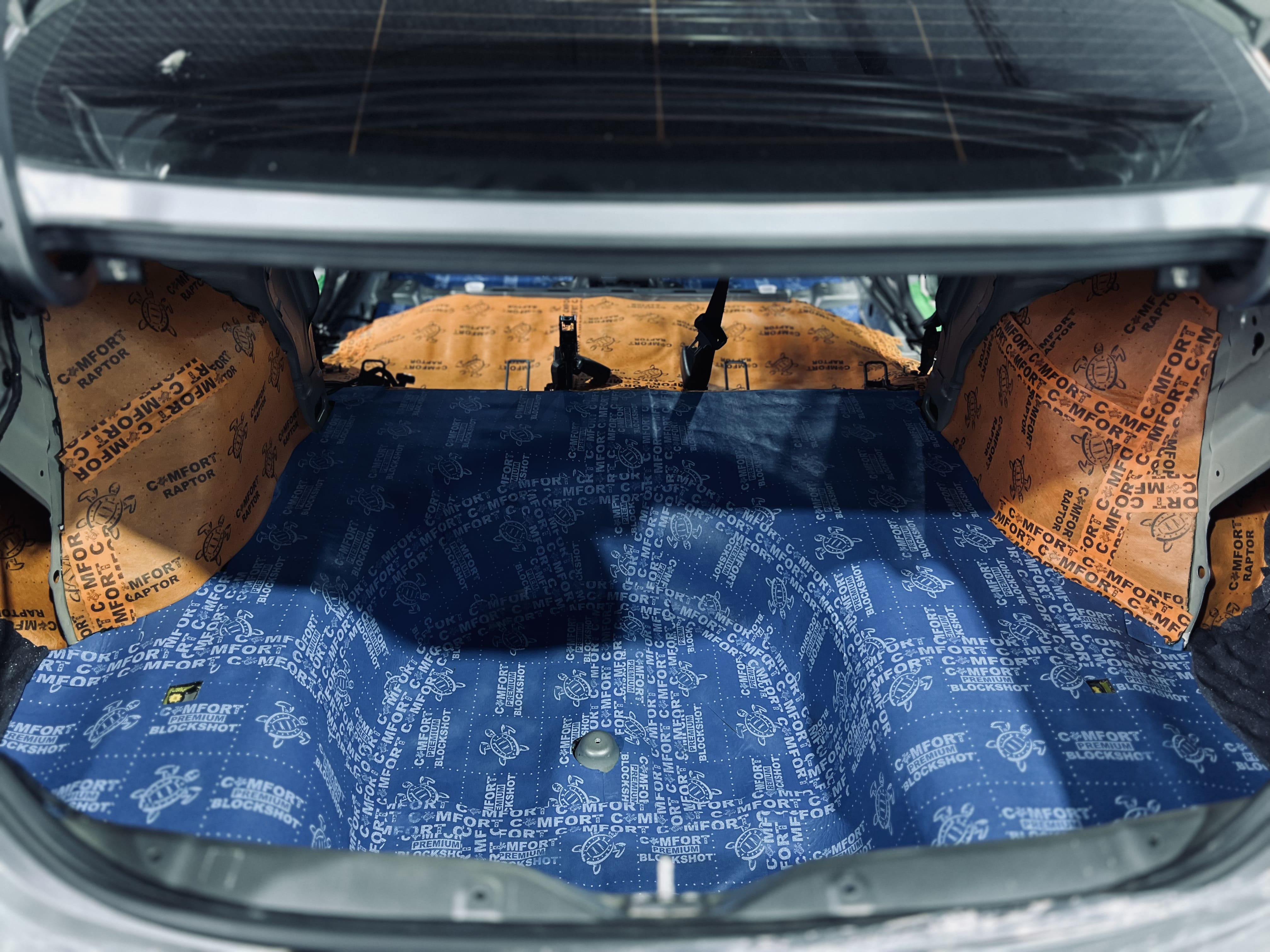В багажнике вторым слоем на дно уложили Comfort Mat Premium BlockShot, на выступающие части над колесными арками – Comfort Mat Raptor, а на стенки – шумопоглощающие волны Comfort Mat Тишина Volna.