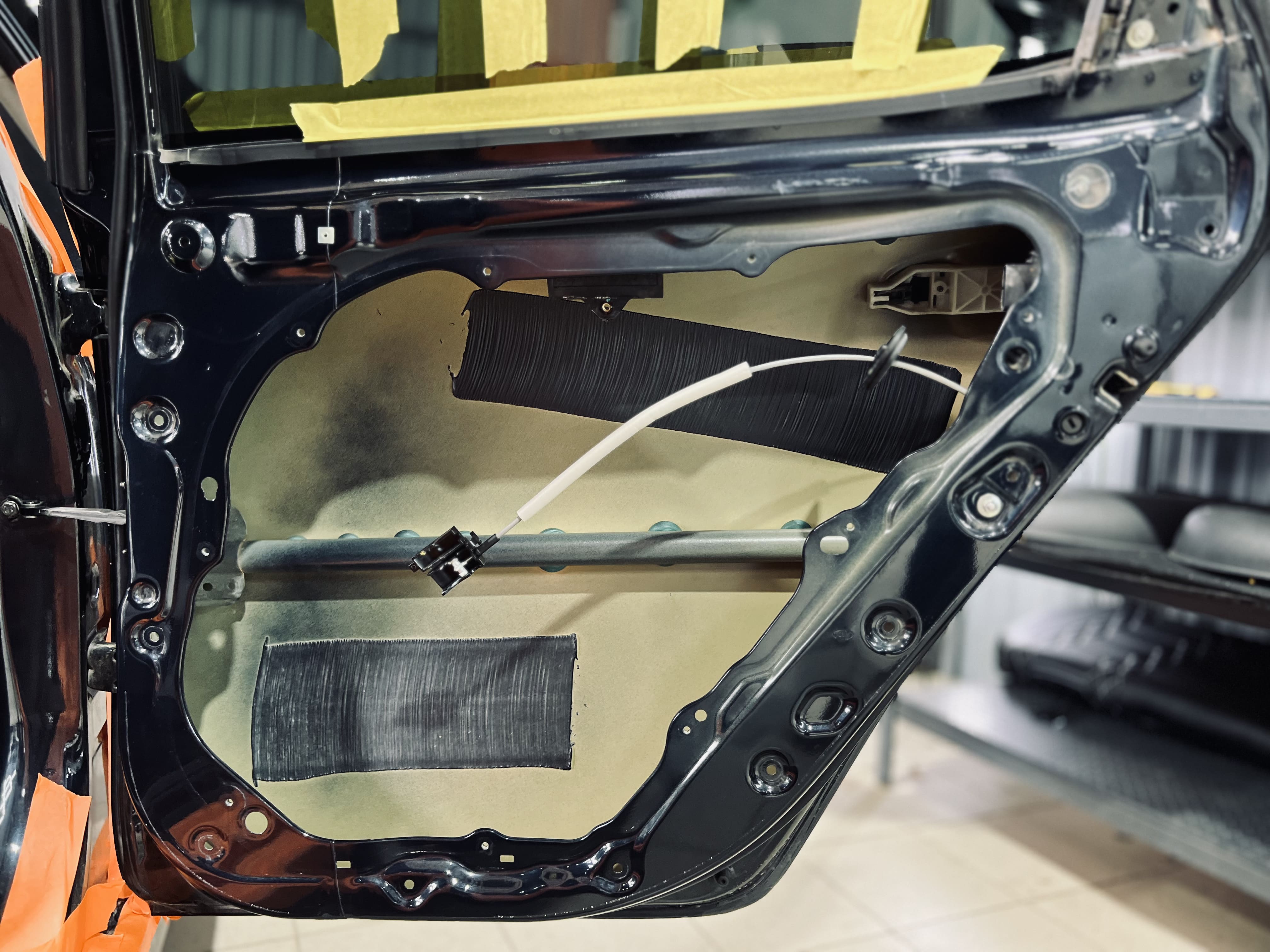 Работа началась с демонтажа дверных карт. На фото показана подготовленная дверь с чистым металлом, готовая к нанесению материалов.