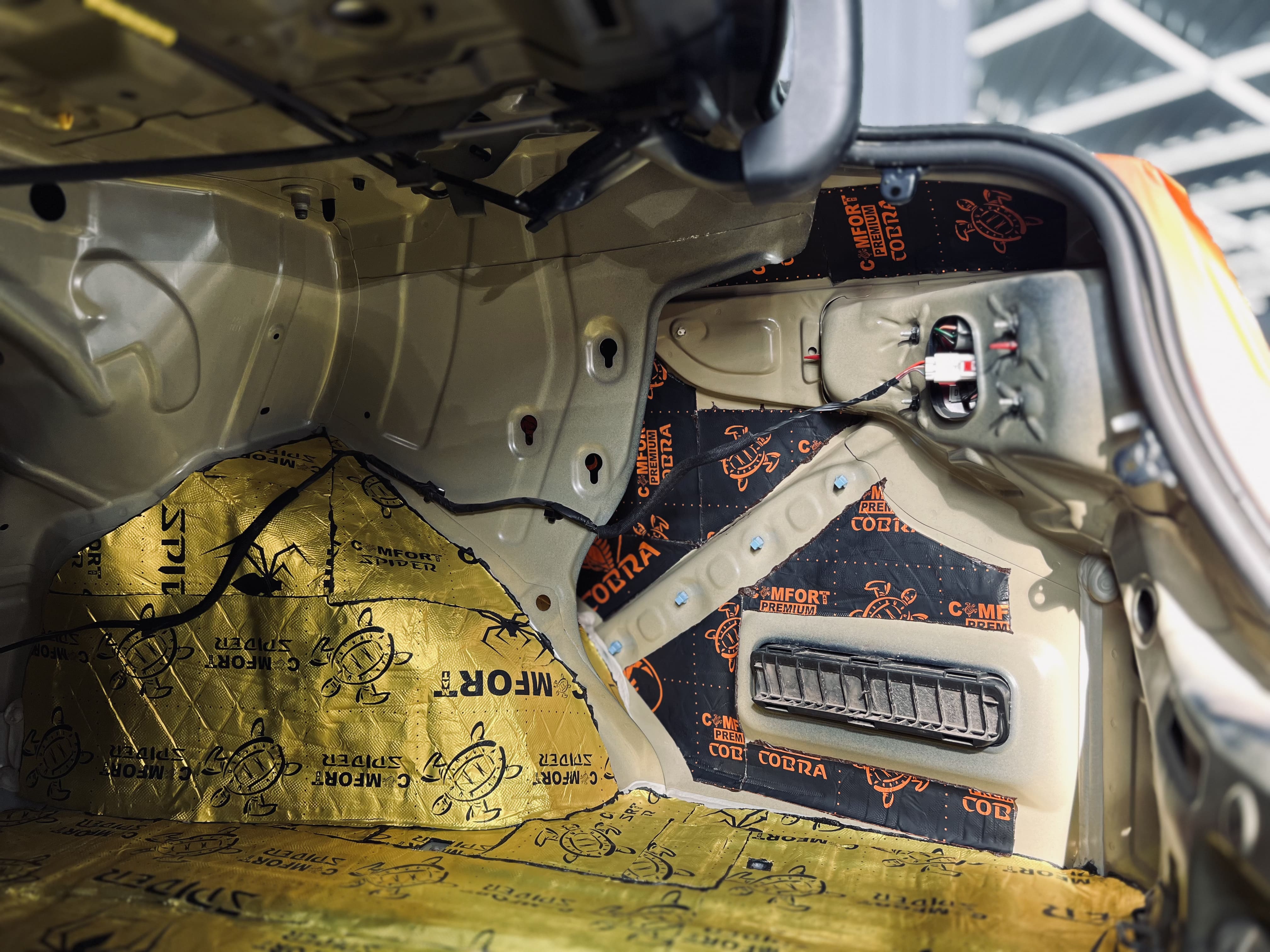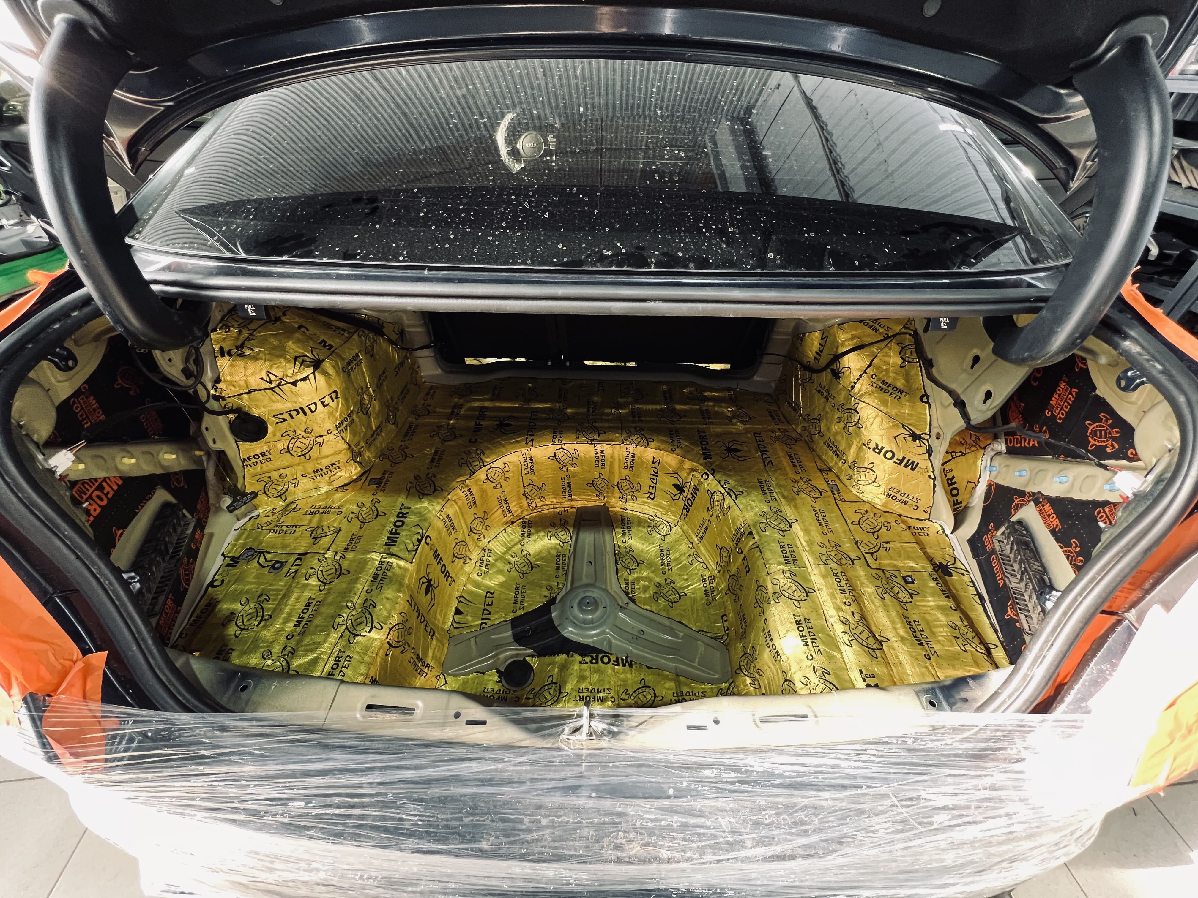 Первым слоем на днище и дно багажника нанесли виброизоляцию Comfort Mat Spider, а на стенки багажника – Comfort Mat Cobra.