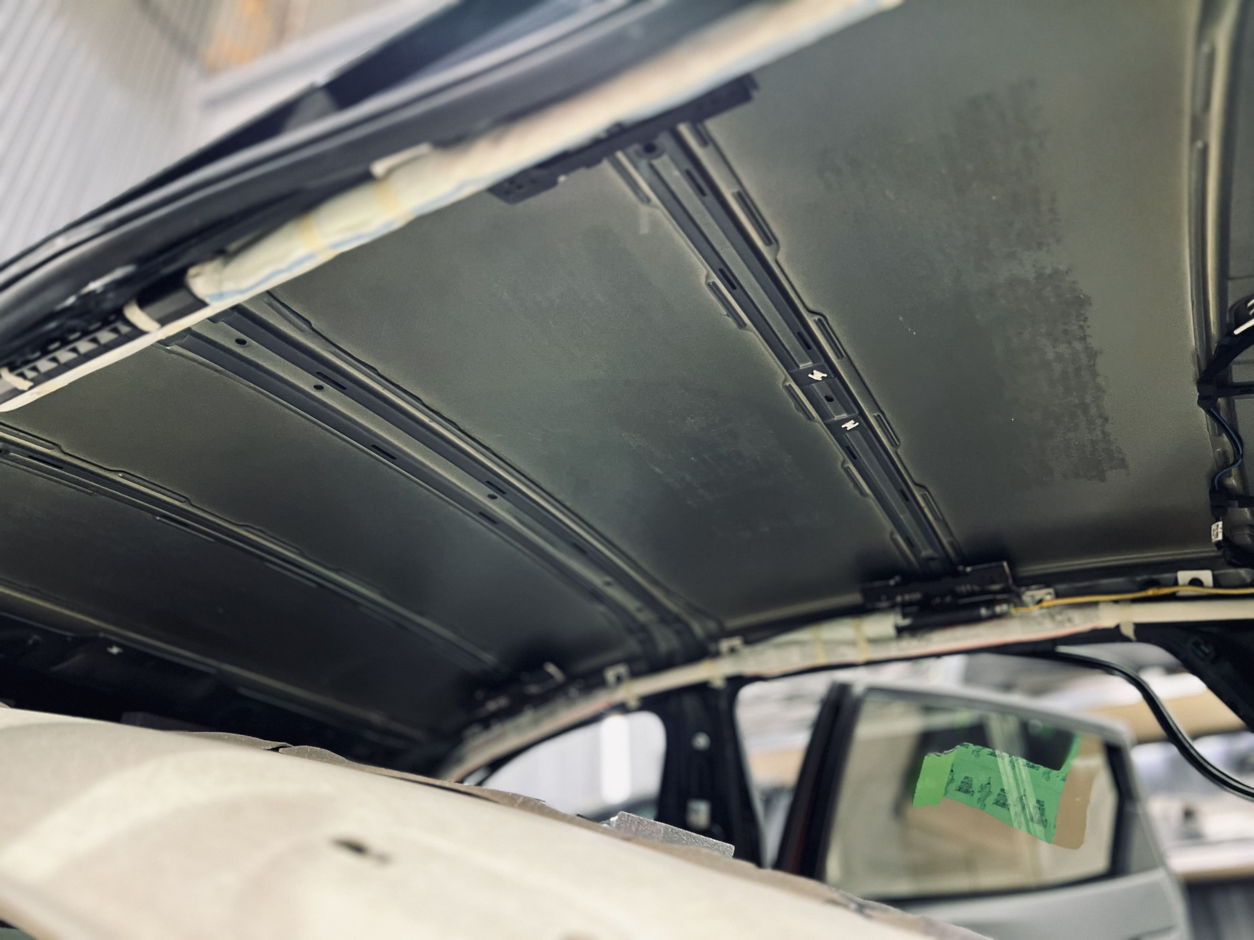 Работа началась с демонтажа потолочной обшивки. Показана крыша с чистым железом, подготовленная для шумоизоляции.