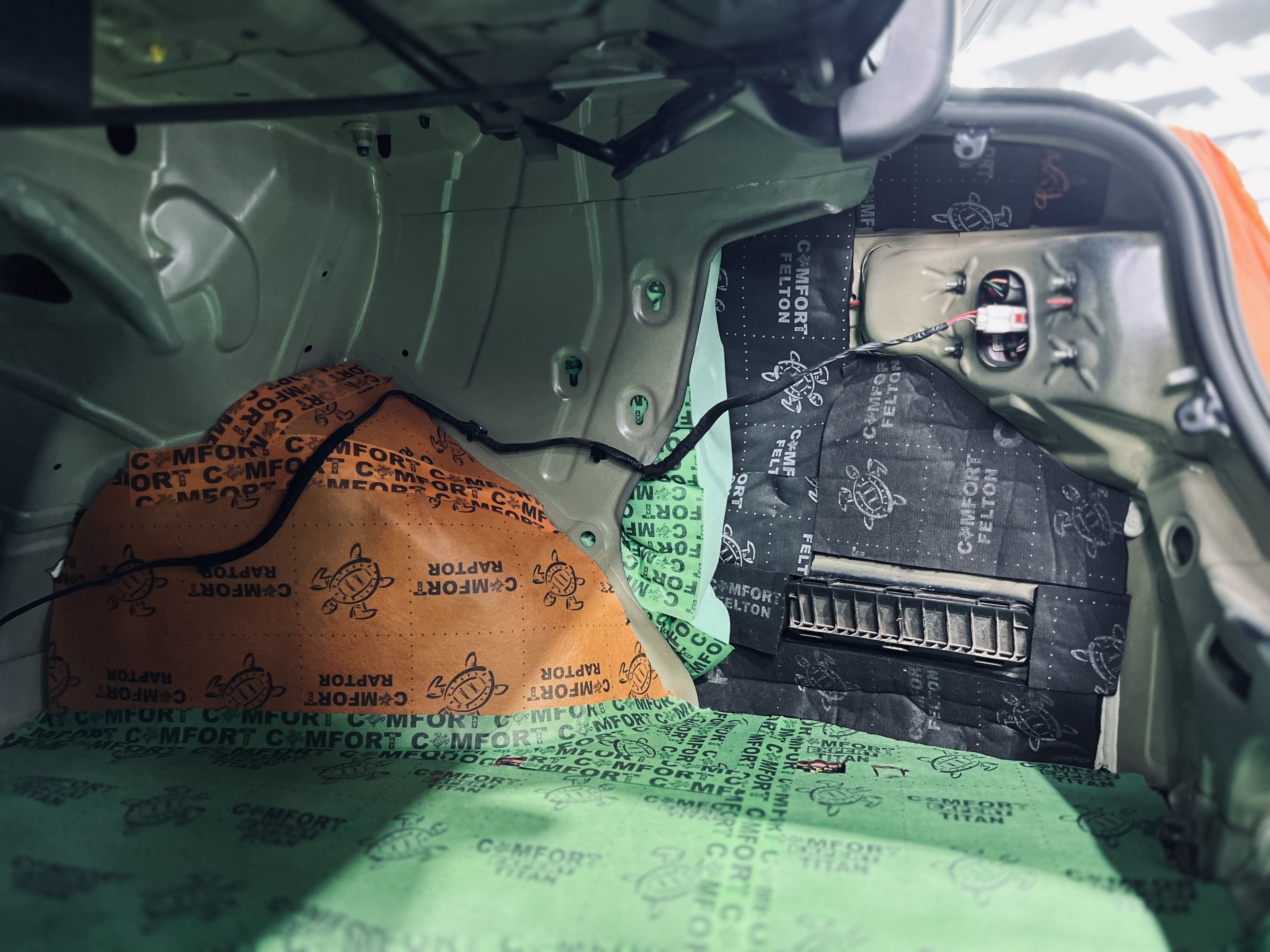 В багажнике вторым слоем на дно уложили Comfort Mat Titan, на выступающие части над колесными арками – Comfort Mat Raptor, а на стенки – Comfort Mat Felton для максимального поглощения шума.
