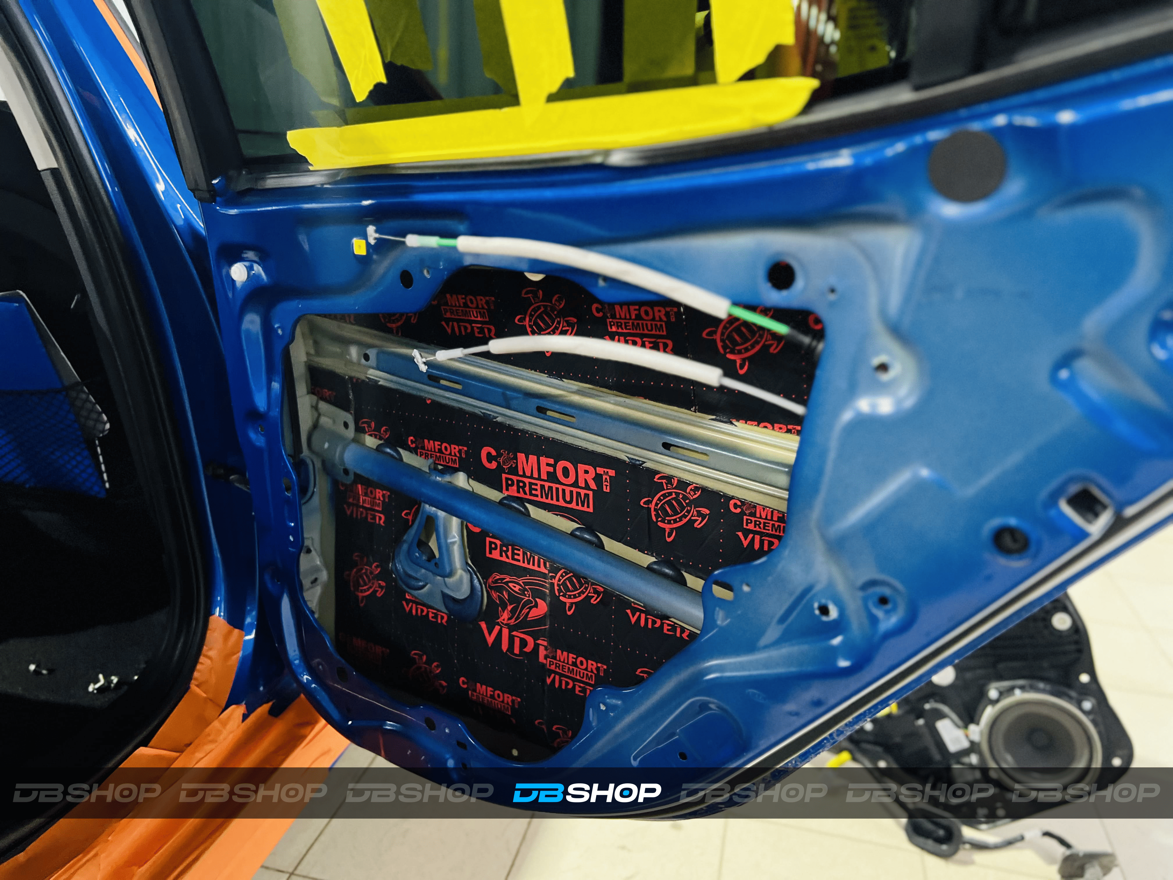 Первым слоем на двери нанесли виброизоляцию Comfort Mat Premium Viper. Ультралегкий инновационный виброизоляционный материал премиального уровня толщиной 3 мм с мастичным слоем и расширенным КМП. На фото видна дверь, покрытая слоем Premium Viper, с аккуратным нанесением.
