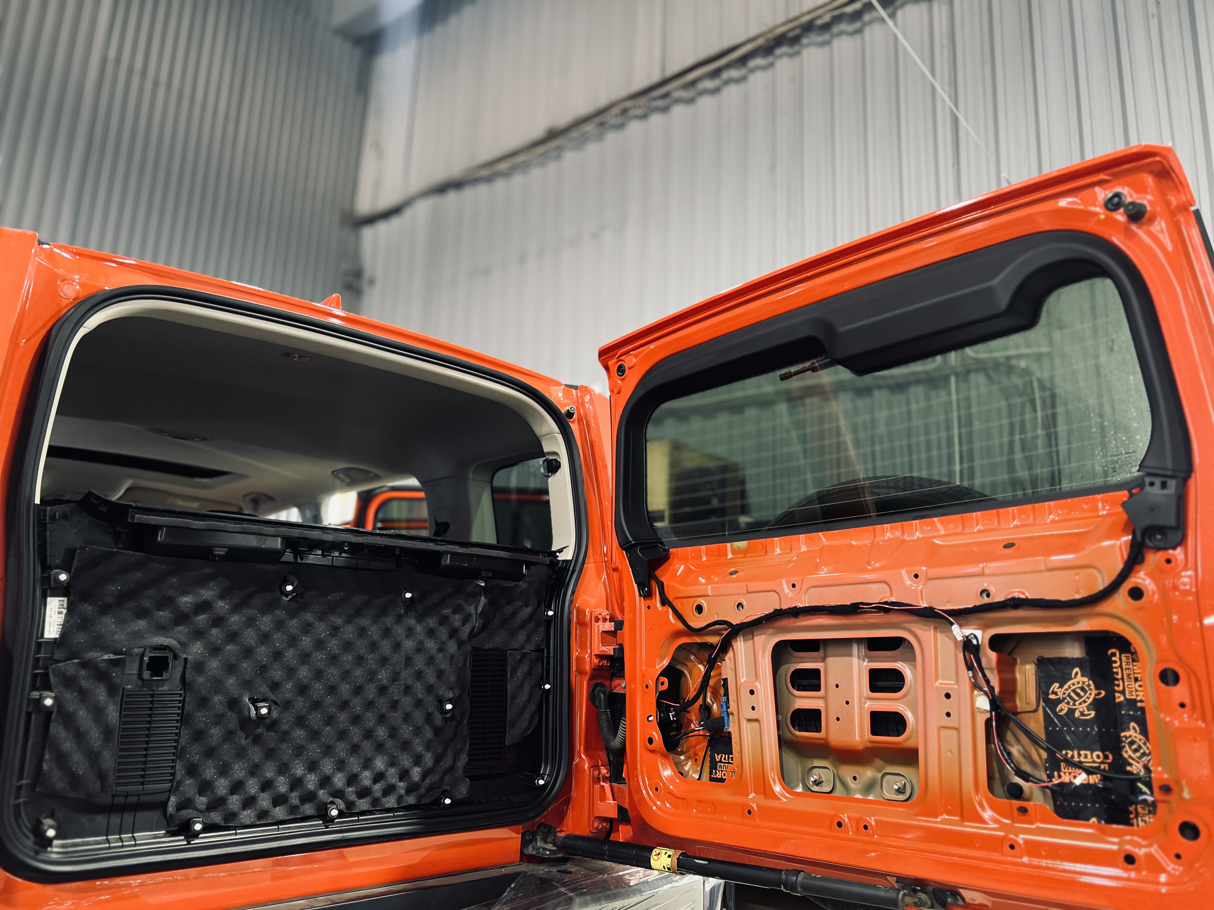 Дверь багажника получила такую же шумоизоляцию, как и двери. На фото показана дверь багажника с наклеенным слоем Cobra и идеально вырезанным Тишина Volna, обеспечивающим максимальное поглощение шума.