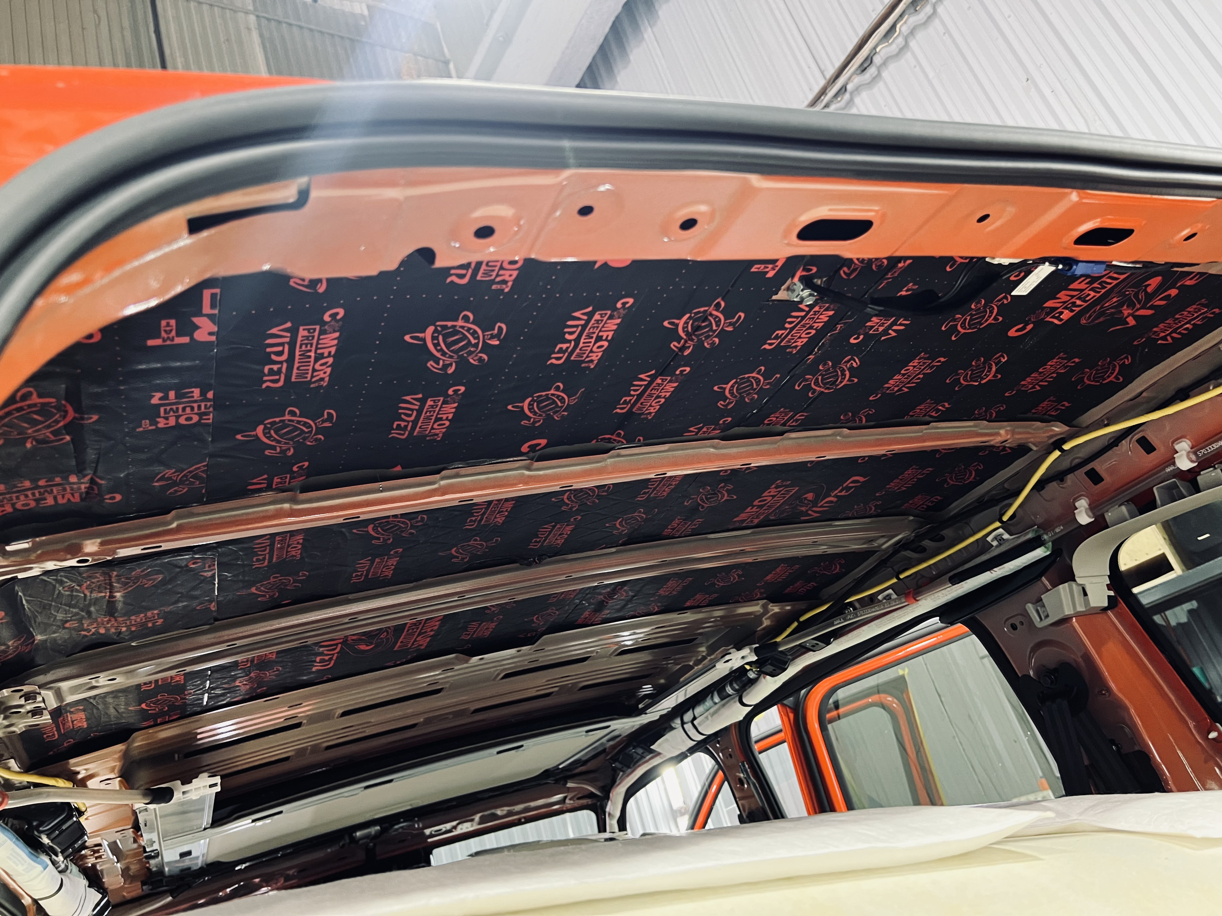 Первым слоем нанесли виброизоляцию Comfort Mat Viper, которая гасит вибрации металла. На фото видна крыша, покрытая слоем Viper, с равномерным и плотным нанесением.